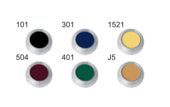 Laadukkaat Creme Make-up maskeerausvärit. Tämän paletin värit ovat suunniteltu erityisesti mustelmien tekoon. Kaikkia värejä voi sekoittaa keskenään.